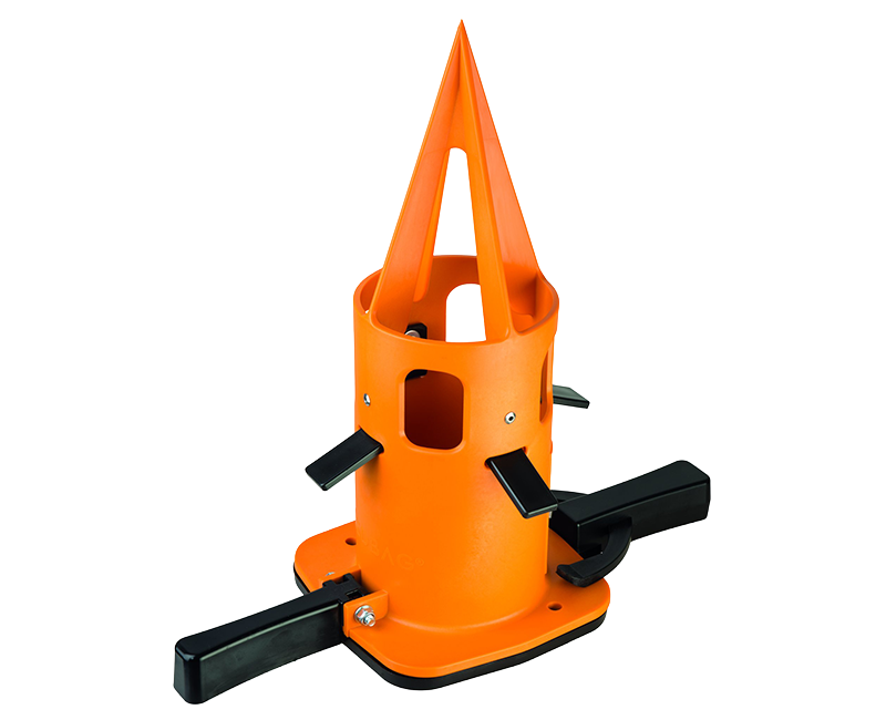 The foldable handle design prevents damage during positioning of the big bag, even if the bag is lowered unevenly. Suitable for both single-use and reusable big bags, it is easily mounted by lowering the bag onto the Fledbag, allowing the tip to pierce the fabric. Once raised slightly, the valve can be opened to discharge the contents in a clean and controlled manner.