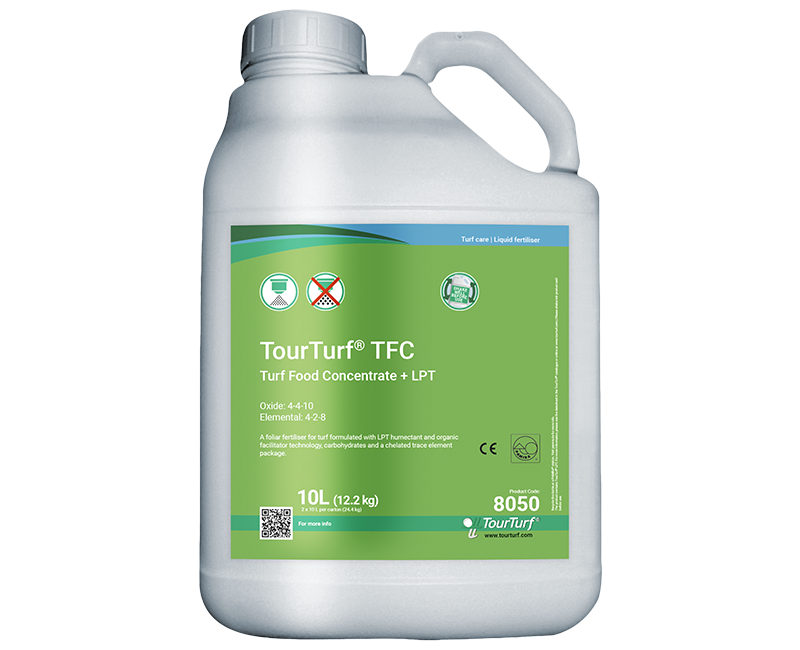 TourTurf® TFC Turf Food Concentrate + LPT is a foliar fertiliser for turf designed for quick leaf uptake of nutrients under different environmental conditions. From both low soil temperatures to high air temperatures with high humidity.