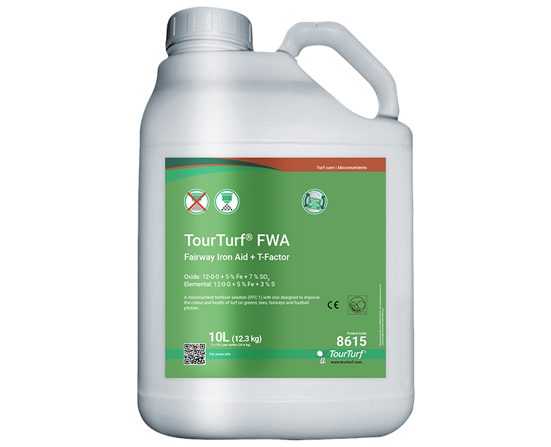 TourTurf® FWA Fairway Iron Aid + T-Factor is a liquid N-fertiliser with iron, sulphur and triacontanol. The product is made of a synergistic blend of urea nitrogen and an effective iron source. The product provides turf nutrition and its pH of 3 helps to acidify the soil profile. The pH of the solution in the spray tank will stay at a low level even when diluted with water. FWA is designed to improve the colour and health of turf on greens, tees, fairways and football pitches.