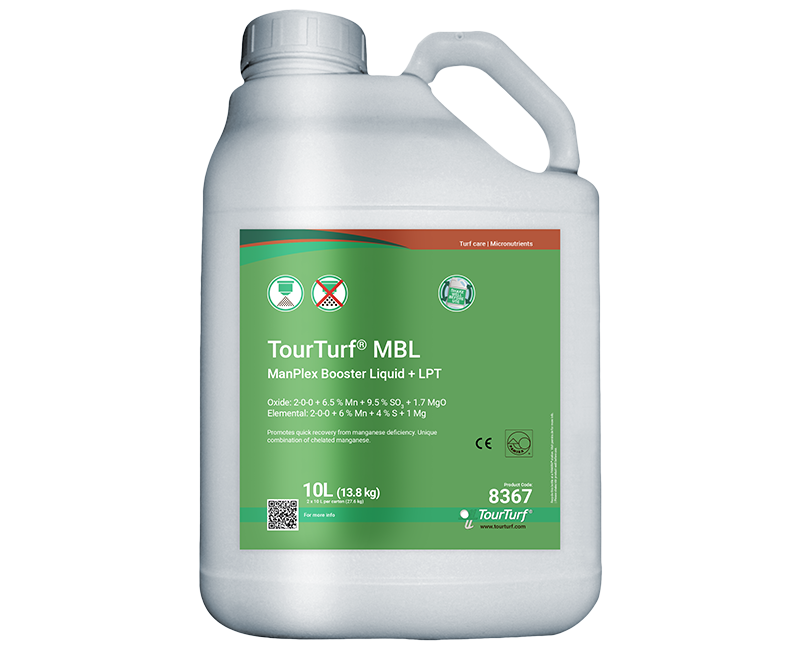 TourTurf® MBL ManPlex Booster Liquid + LPT Leaf Penetrant Technology is a liquid micronutrient fertiliser with nitrogen, manganese, sulphur and magnesium. Also contains aromatic plant extracts for enhanced turf resiliency. Manganese is critical in the plants resistance against take-all patch. Use TourTurf® MBL as an efficient remedy for manganese deficiency in all types of sports turf.