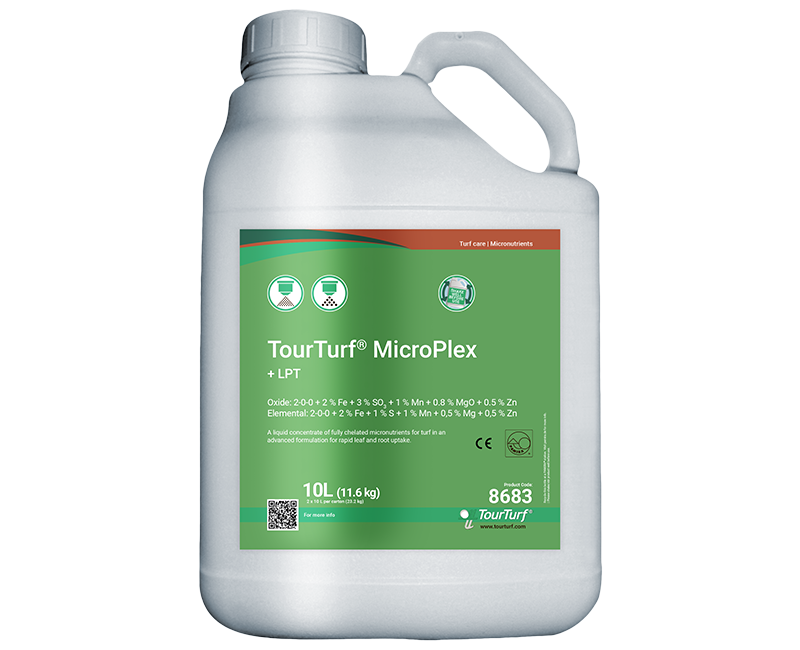 TourTurf® MicroPlex + LPT Leaf Penetrant Technology is a liquid micronutrient-fertiliser with fully EDTA-chelated micronutrients and aromatic plant oils that ensures a quick uptake into turf roots and via the leaves. Use TourTurf® MicroPlex to provide all the essential micronutrients and to balance any micronutrient deficiency.