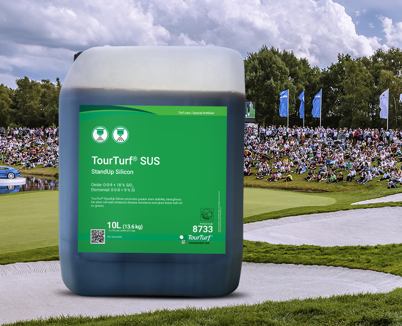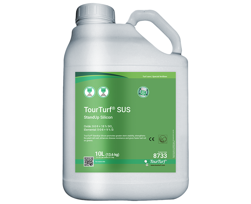 TourTurf® SUS StandUp Silicon is a liquid K-fertiliser with silicon. SUS promotes the growth and development of turf during periods of plant stress and drought. The product provides greater strength in the cell walls and stiffer leaves responsible for the faster ball roll on greens, greater tolerance to environmental impacts, as well as reduced sensitivity of the plant to pests and fungal diseases.