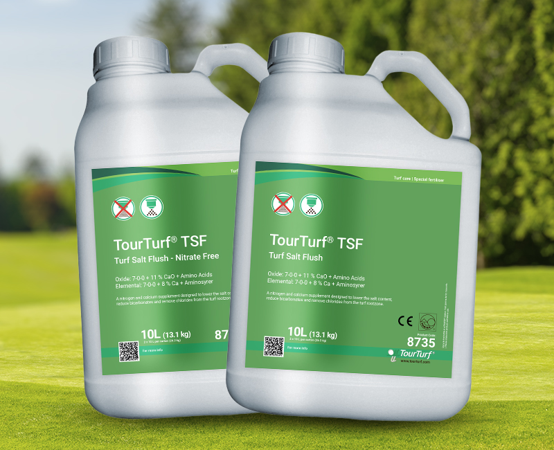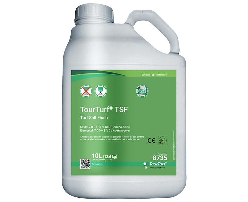 TourTurf® TSF Turf Salt Flush is a liquid Nitrogen fertiliser with Calcium, amino acids and carbohydrates that lowers the salt content and reduces existing bicarbonates and chlorides in the rootzone leading to healthier turf. TourTurf® TSF balances the salinity around in the root zone, allowing the plant to absorb water without high osmotic pressure even when using low quality irrigation water, waste water or being influenced by seawater.