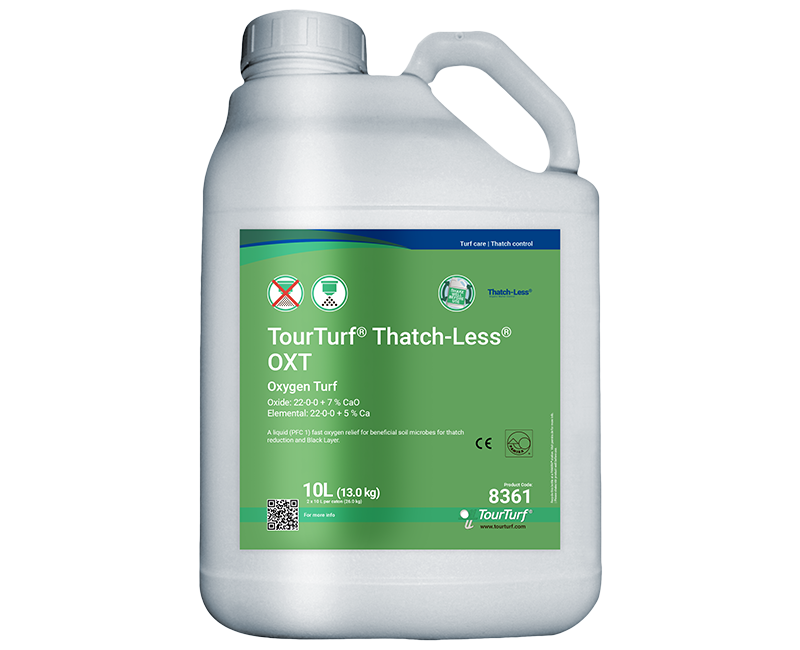 TourTurf® Thatch-Less® OXT Oxygen Turf is a liquid N-fertiliser, containing an oxygen release technology comprised of six oxygen and nitrogen compounds. A blend of wetting agents from a unique manufacturing process is added to achieve the high specifications and to ensure chemical stability. Use TourTurf® Thatch-Less® OXT to give a rapid release of oxygen to anaerobic rootzones to assist in thatch reduction, in Black Layer alleviation, as a cold spring starter fertiliser and to aid in quick recovery and restore density after disease.