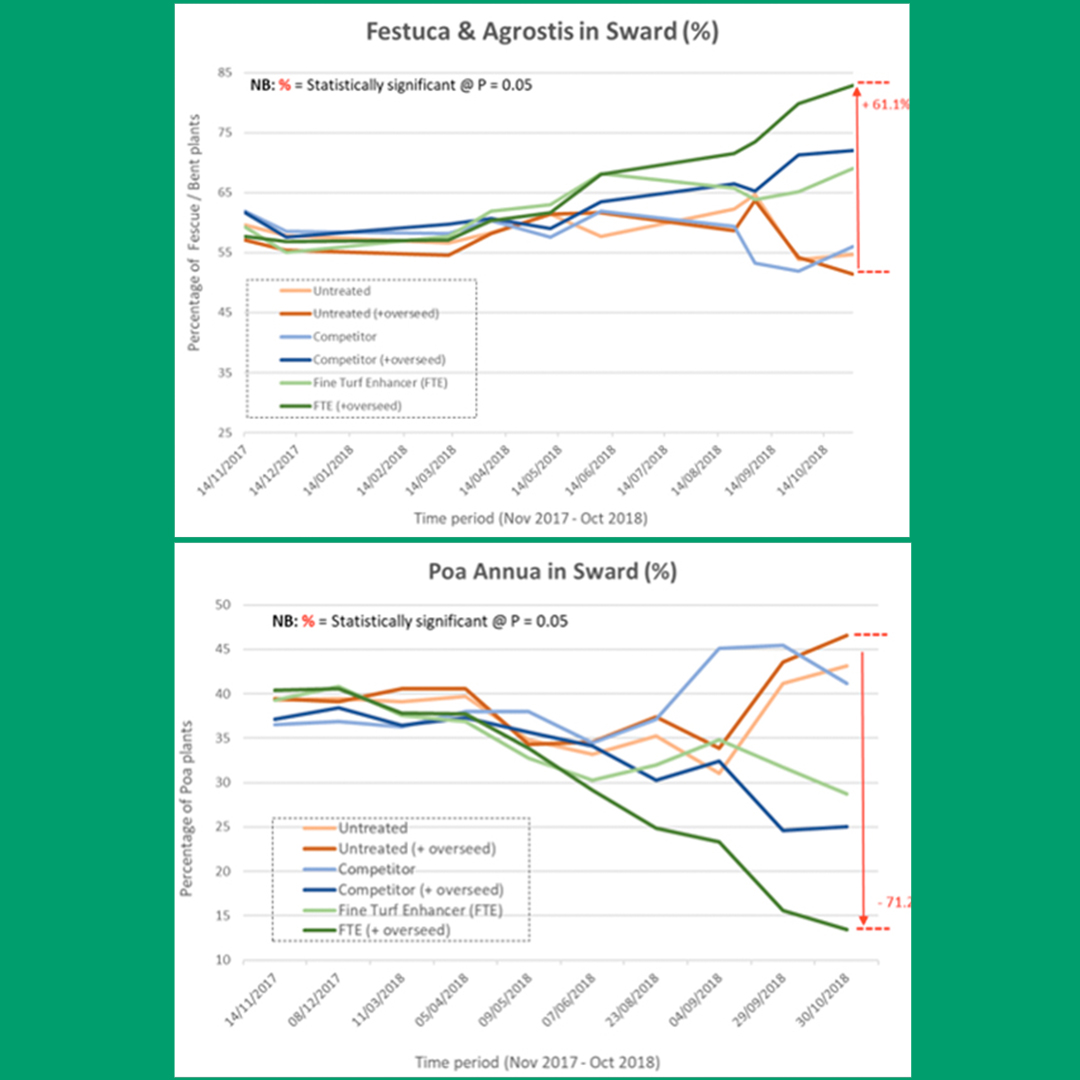 Subsequently, FTE continues to assist the competitiveness and survivability of the bent and fescue seeds in the sward by favouring their growth against Poa annua.